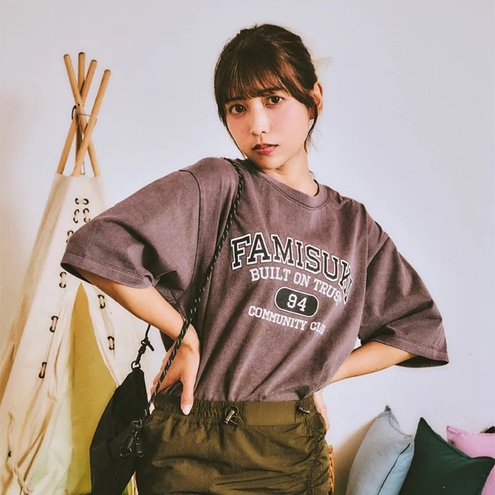 気温の上がる春夏に嬉しい肌触りの良いさらっとした素材感のベーシックTシャツ。クレヨンで描いたような『FAMISUKI』のブランドロゴがデザインのアクセントです。